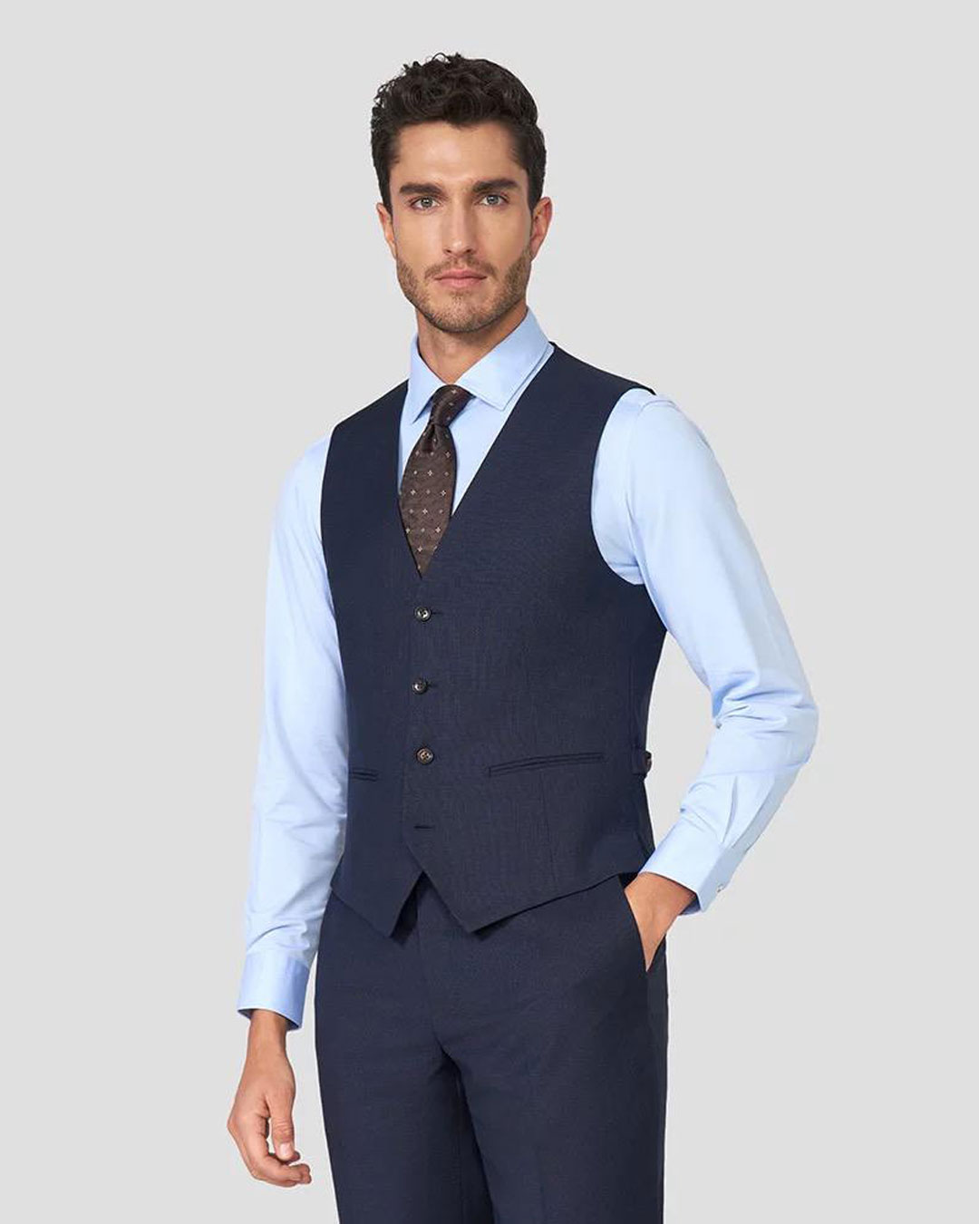 Hair: Short, dark brown